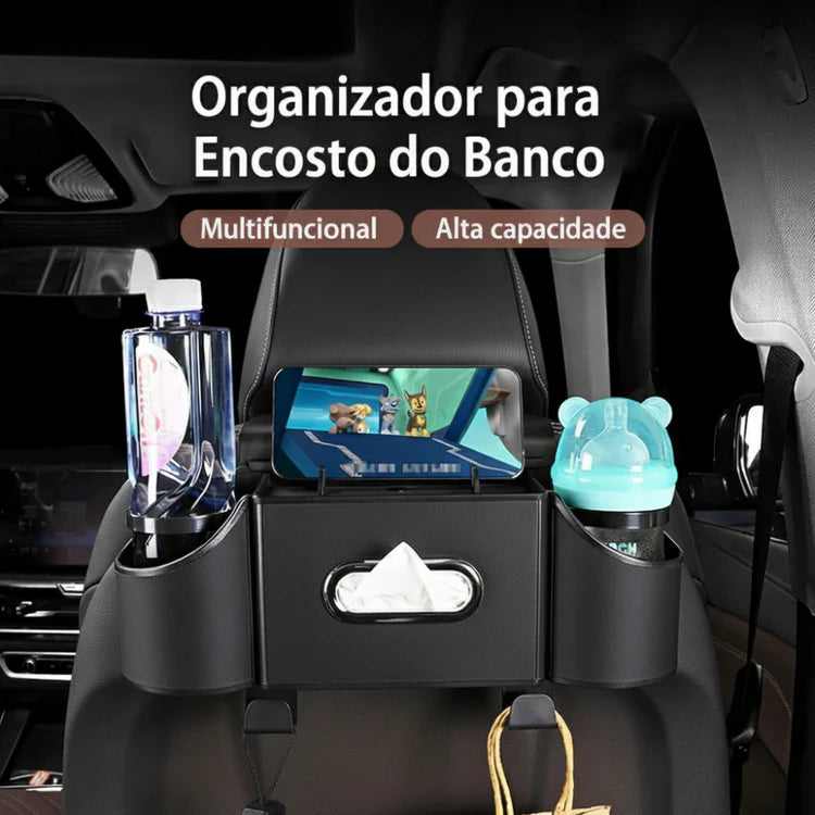 Possui compartimentos para garrafas de água, gaveta para caixa de lenços, ganchos para bolsas e suporte para telemóvel – maximizando cada centímetro do espaço do banco traseiro.